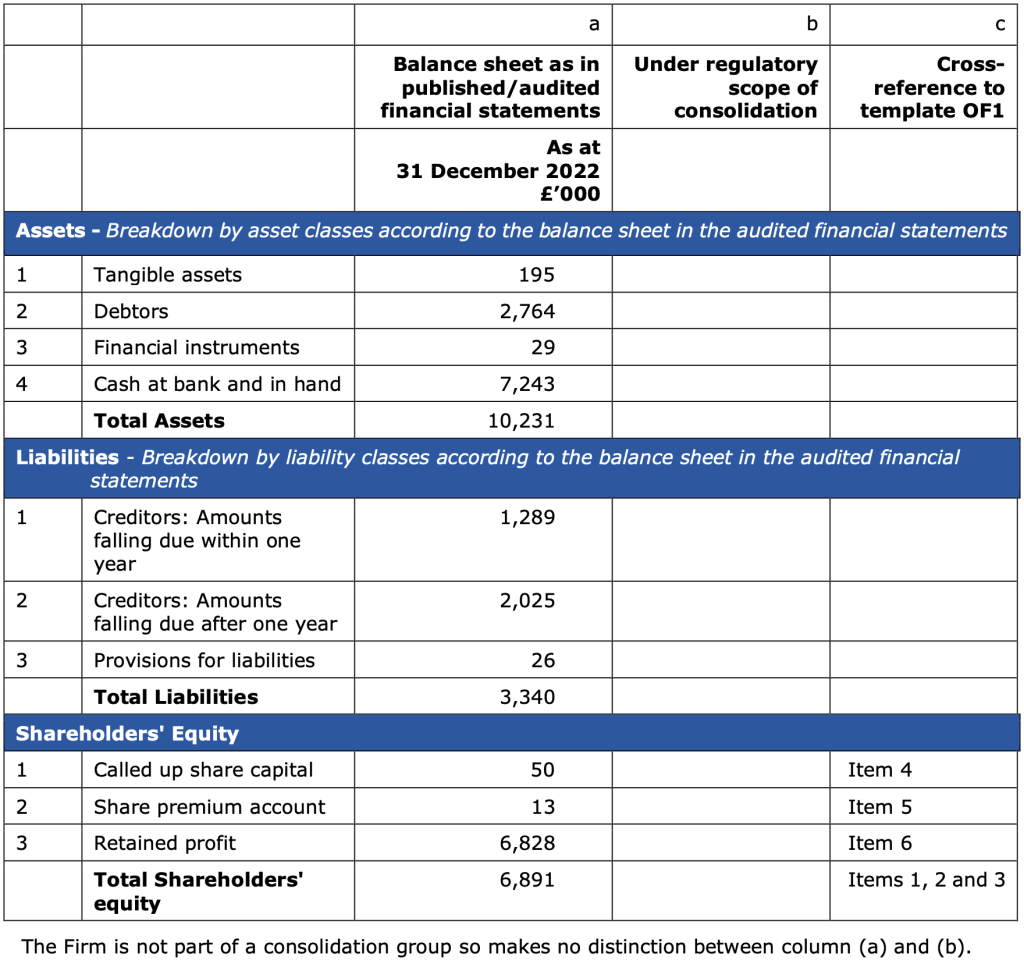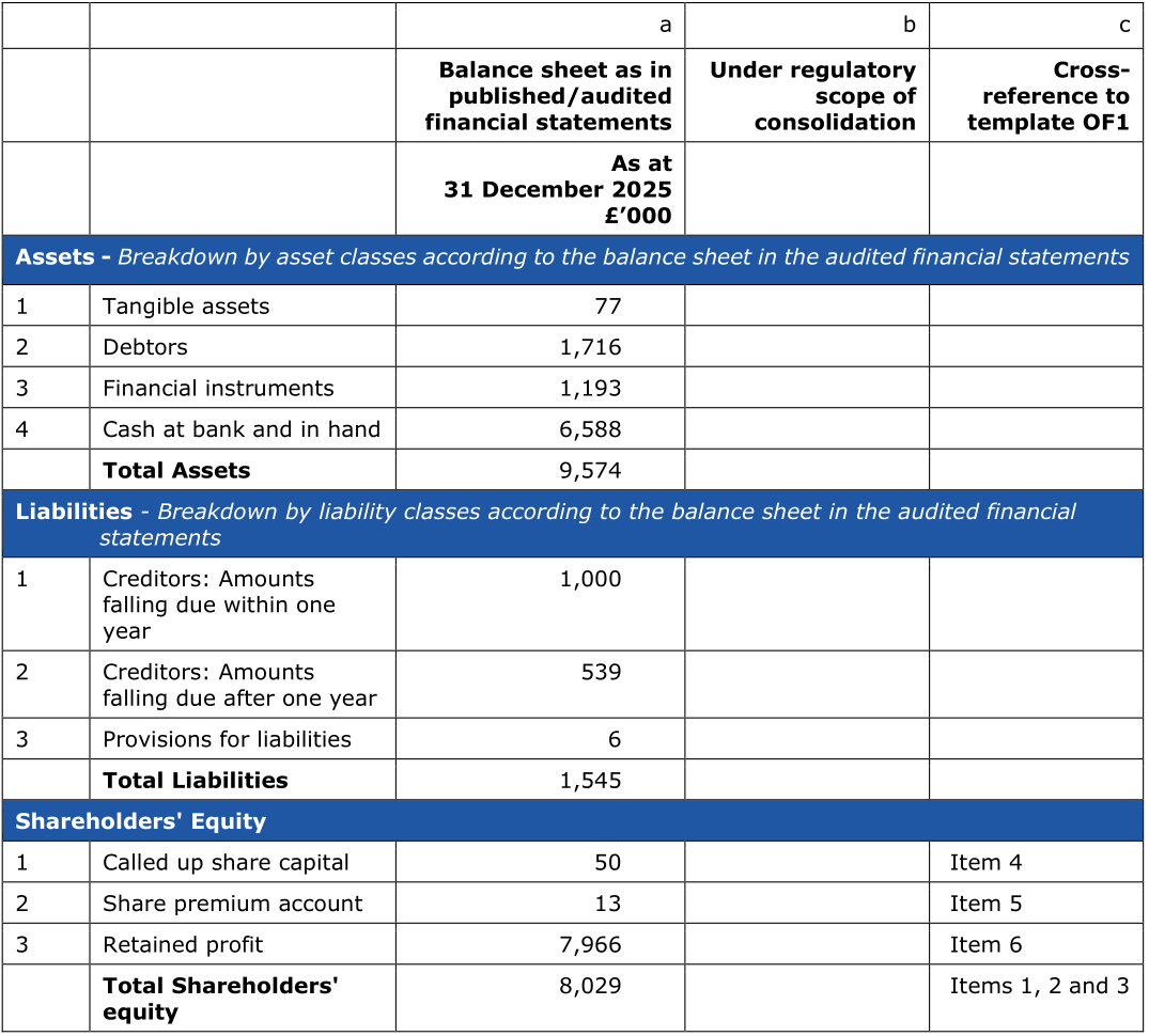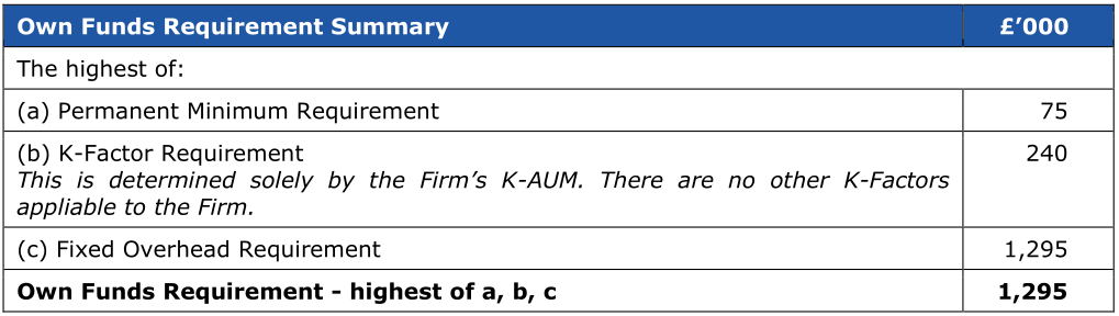 The Firm’s capital resources at 31 December 2024 are held in the form of Common Equity Tier 1 Capital consisting of share capital, share premium and audited retained earnings. The Firm does not hold any Additional Tier 1 Capital or Tier 2 Capital.