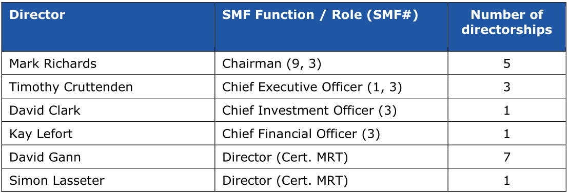 The Firm’s Senior Management Arrangements Systems & Controls (“SYSC”) roles and responsibilities matrix identifies all key areas of the Firm’s business and operations and documents those individuals responsible for each key area. This matrix is reviewed and ratified at least annually by the Board.