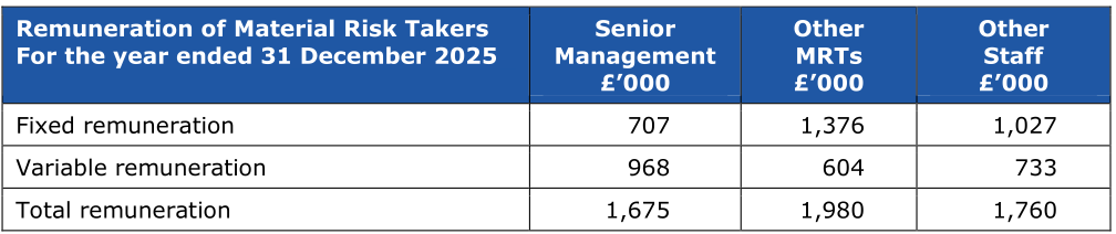 The Firm has identified 13 material risk takers (MRTs) for the reporting year of which five are senior management and eight are other MRTs. No MRT received guaranteed variable remuneration or any severance payments in the reporting year.